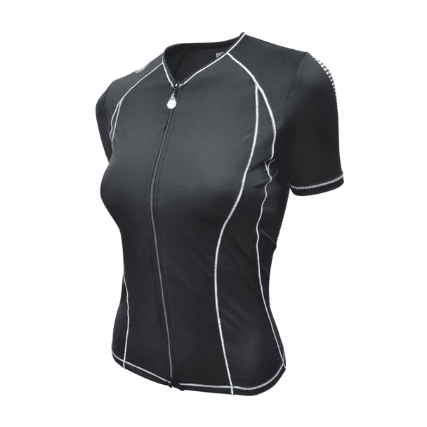 The Forza Femme Collection has been spared no expense to provide you with the ultimate in comfort, fashion and performance. This piece is made entirely of Skin Cooler™ for the ultimate in effective heat management. 3 back pockets, full front YKK® zipper, and flatstitch seams. This new sleeved version provides you with much needed sun protection for long rides, runs or races. The Skin Cooler™ sleeves extend over the deltoids.